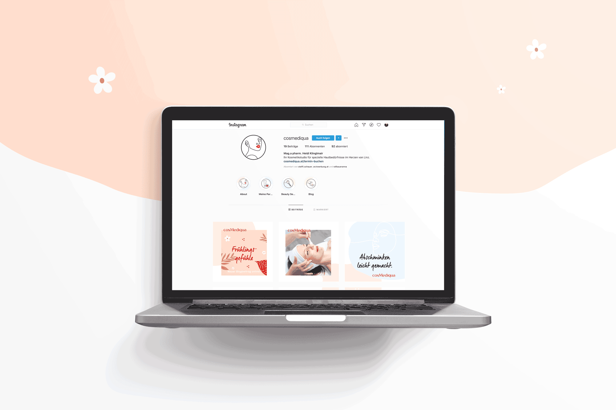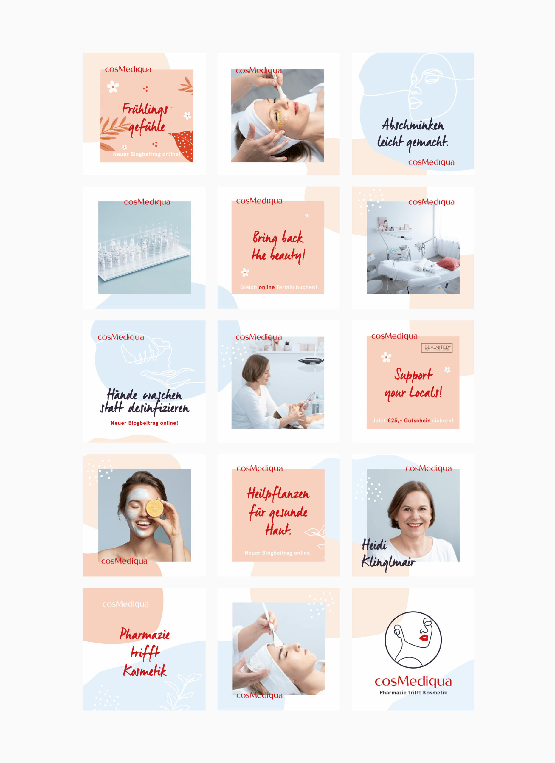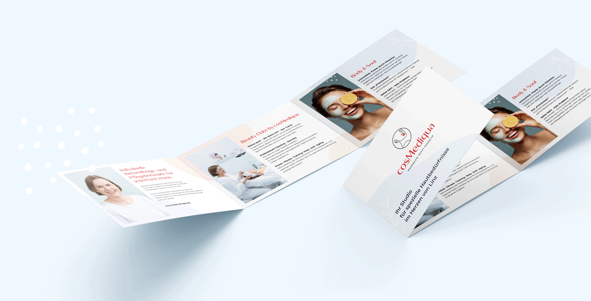 Cosmediqua betitelt ein Kosmetikstudio im Zentrum von Linz. Das Projekt entstand während meiner Agenturzeit bei Grafield, wo ich dem Unternehmen eine Corporate Identity geben und mir überlegen durfte, wie die Präsenz online als auch offline aussehen könnte.